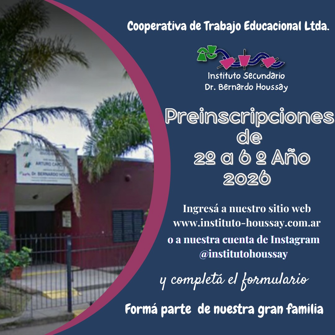 Secundario Pre inscripciones para estudiantes nuevos de 2º a 6º año 2026 Noticias - Inst. Dr. Bernardo Houssay 01 Diciembre 2025 Imprimir Correo electrónico
